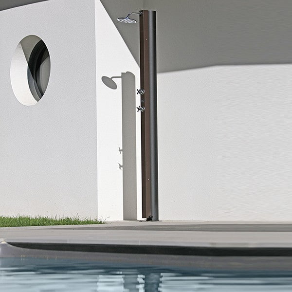 With Aquabella Brown, you're choosing a refined and elegant solar pool shower whose designer touch is highlighted by the cross-shaped metal faucets. The wide shower head of this shower reproduces the impression of falling rainwater and relaxes as much as it rinses the bather before or after swimming. The dual benefit of a solar pool shower is that it both refreshes and relaxes.