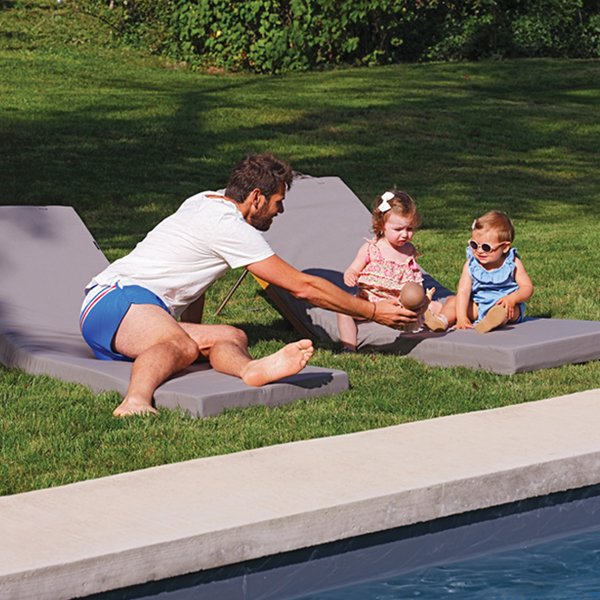 Un matelas pour extérieur qui offre plusieurs façons de l’utiliser, sur un transat, à même le sol, ou associé à la têtière de plage Dona :