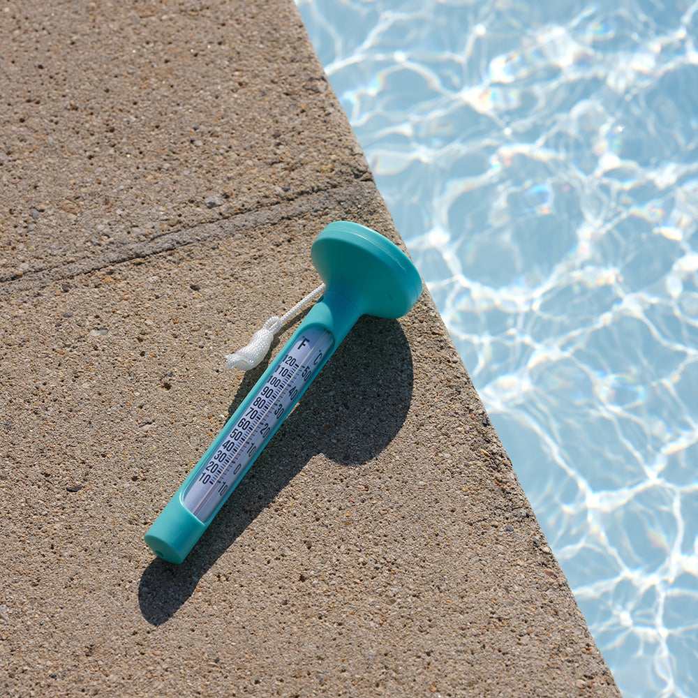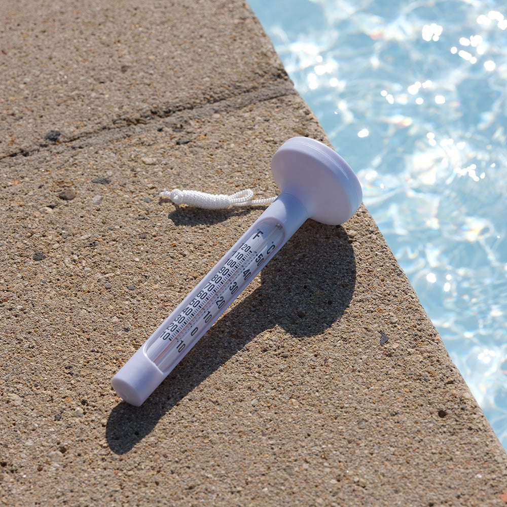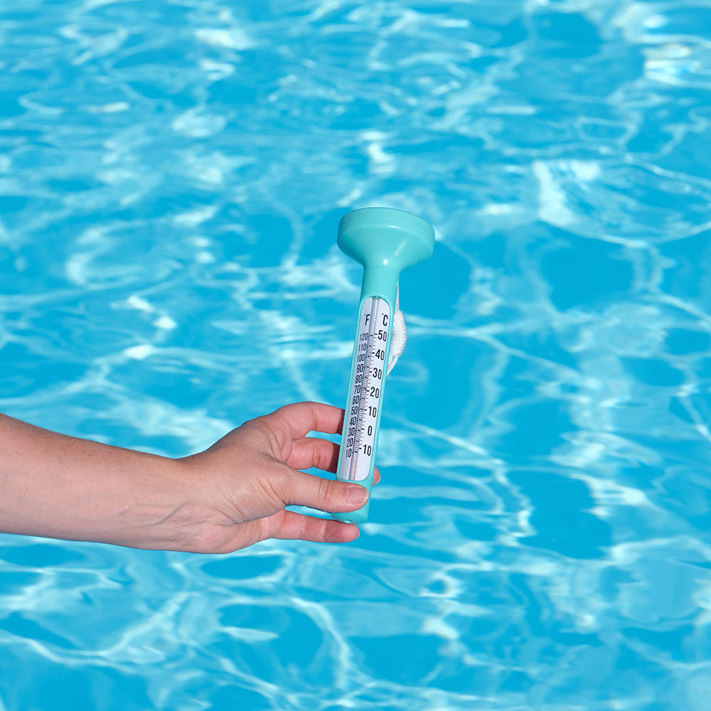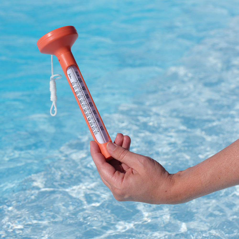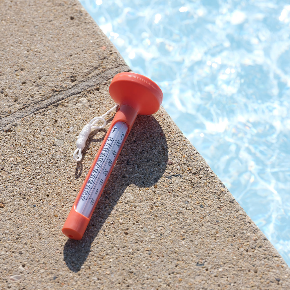 Un thermomètre rond piscine muni d’une cordelette, pour toujours le garder à portée de main :